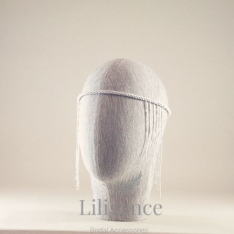 Headband part is silvery white twisted rope which measures 56cm/22inches doesn't have an opening on the back.